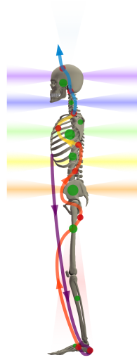 Through the activity of the waves and activating the acceleration points, the chakras are opening up to their full potential and shine stronger so that the energy around the silhouette of the body is fulfilling the outside space.